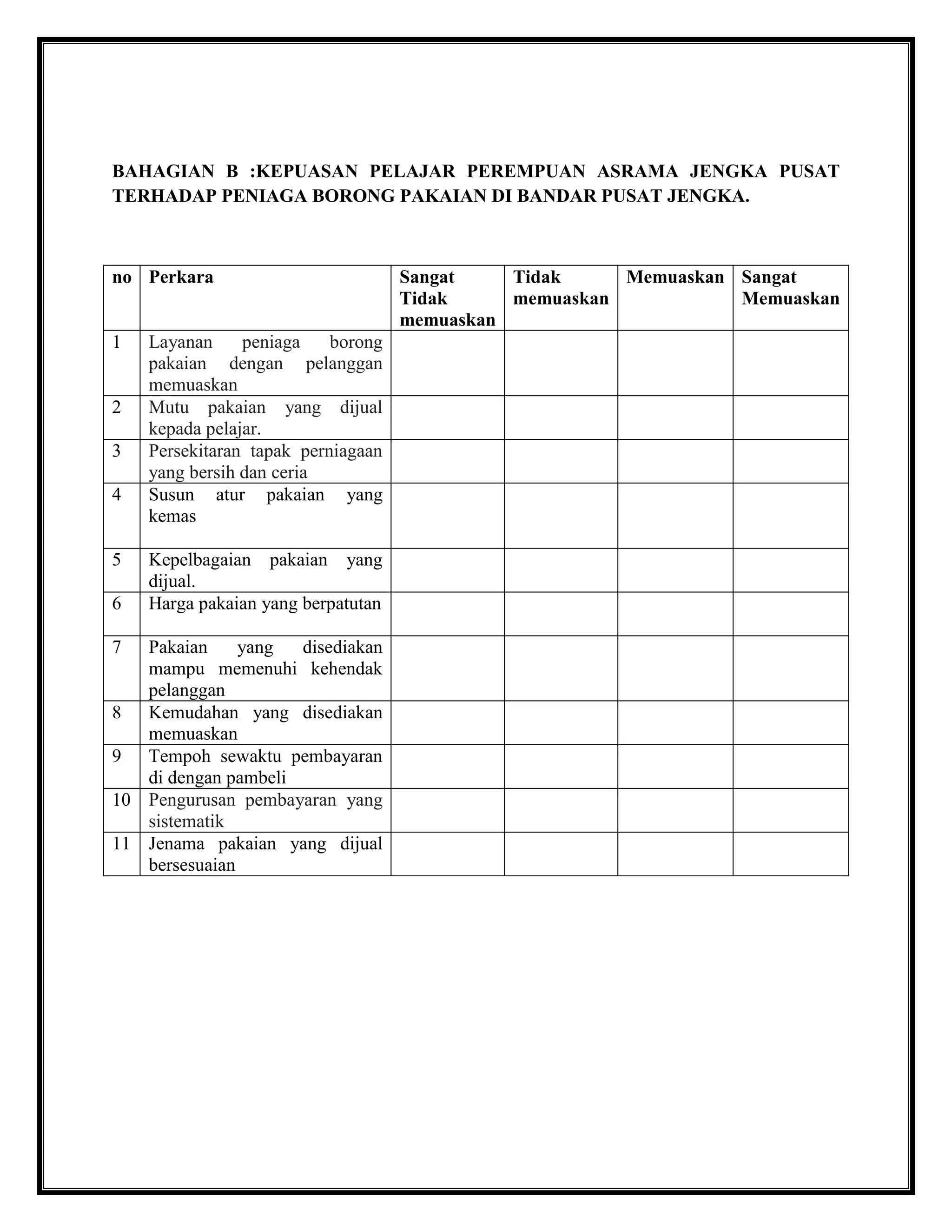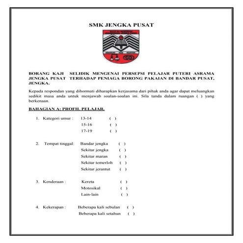 BORANG KAJI SELIDIK KEPUASAN PELANGGAN UNIT POS KENDERAAN BAHAGIAN PENTADBIRAN Bahagian ini sedang berusaha untuk meningkatkan kualiti perkhidmatan. Bantu kami memperbaiki perkhidmatan kamiBorang Soal Selidik. Contoh Borang Soal Selidik Kerja Lapangan Geografi.