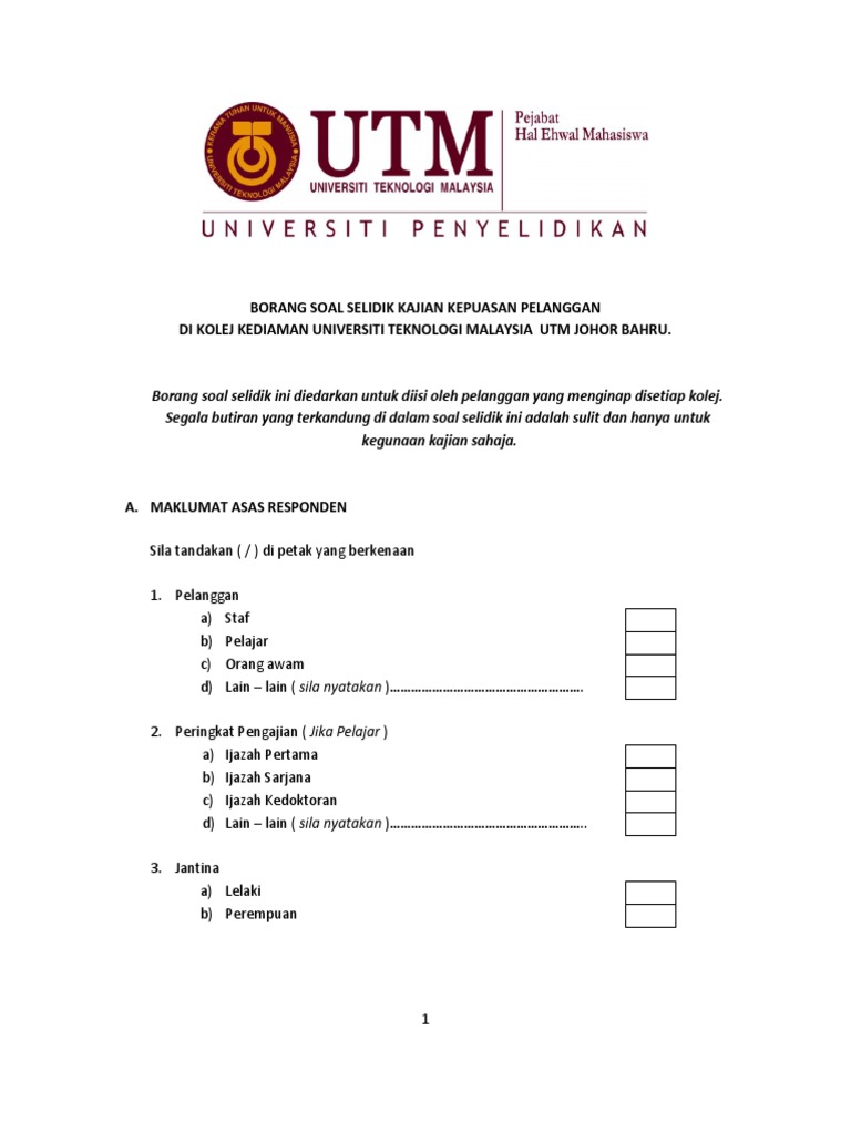 Tuan memohon kebenaran untuk menjalankan soal selidik dalam kalangan pelajar lelaki tingkatan lima aliran sastera smk sri aman. Pdf borang soal selidik kajian kepuasan pelanggan pdf 121 kb. Borang Soal Selidik Pa Pdf Contoh borang soal selidik tentang makanan contoh waouw cute766 doc borang soal selidik tahap kepuasan pelancong.